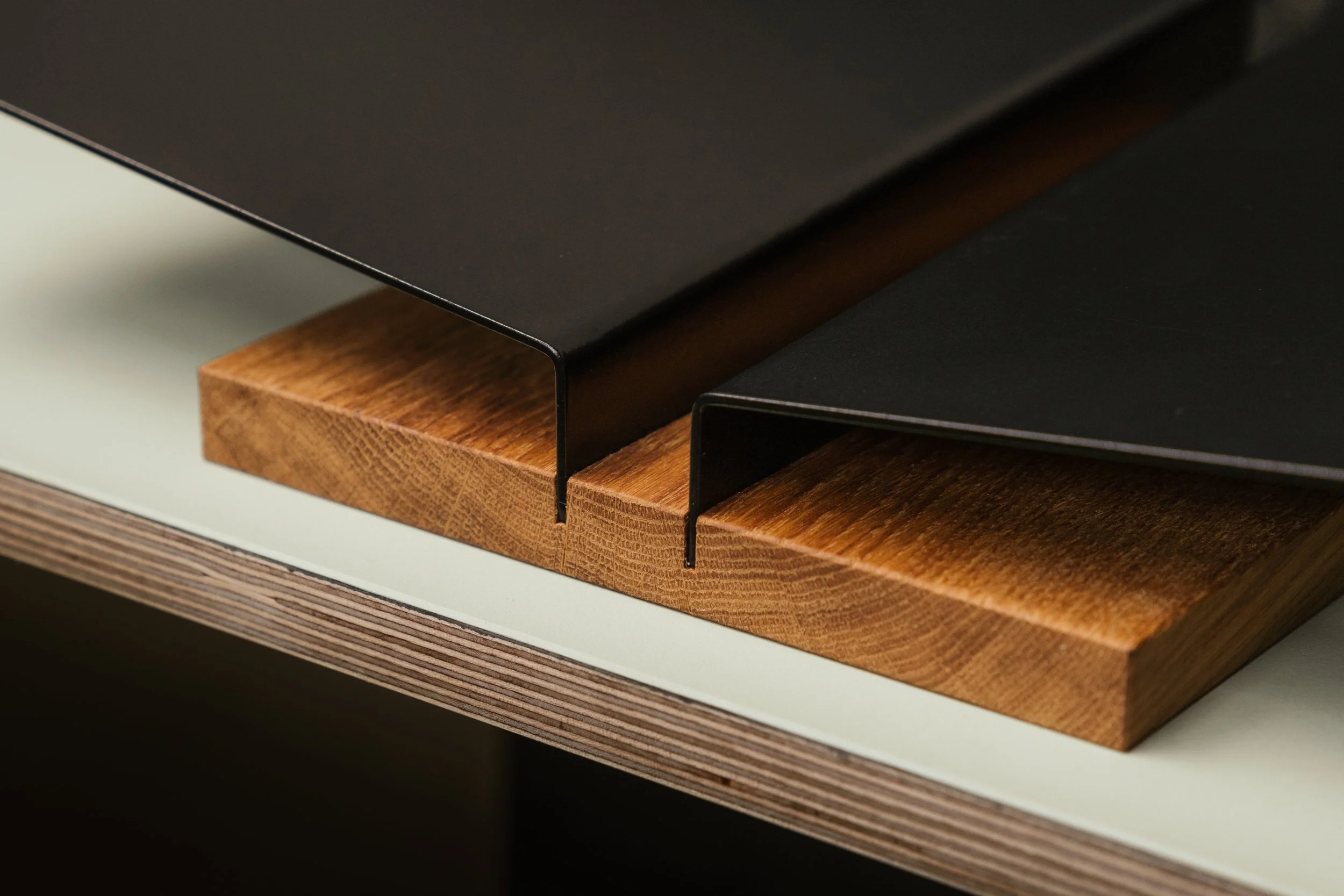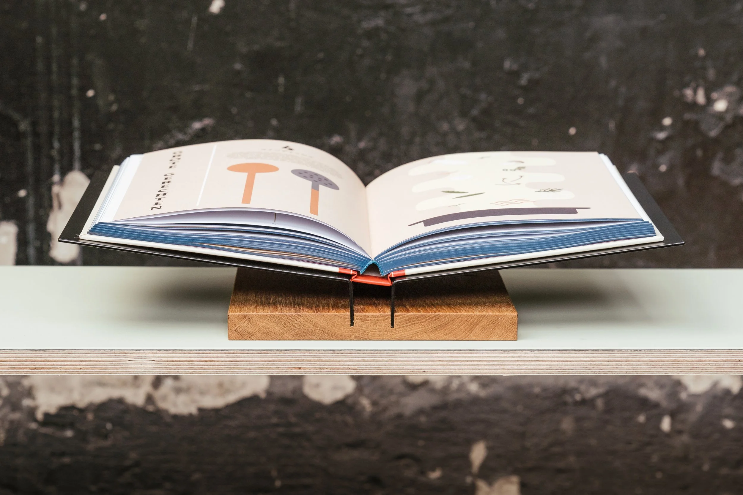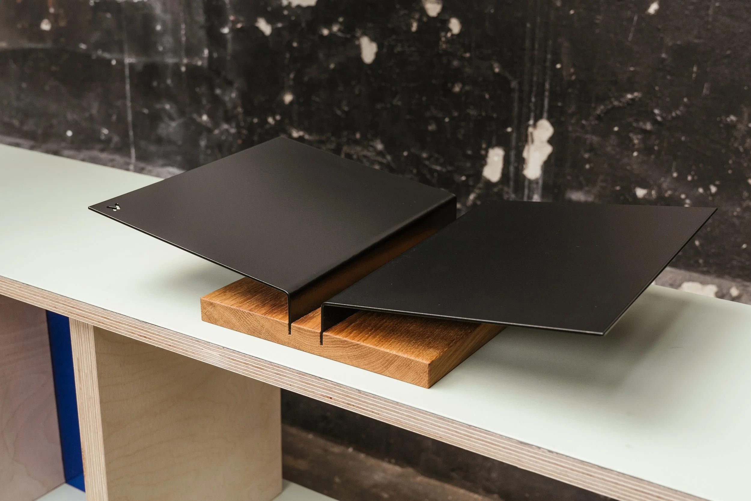 Boekenstandaard gemaakt van eikenhout en zwart gepoedercoat staal. Het staal is gebogen in een hoek van 3 graden waardoor het boek gekanteld staat maar niet van de standaard kan glijden. Past perfect op een laag dressoir om je favoriete pagina van een boek te showen.