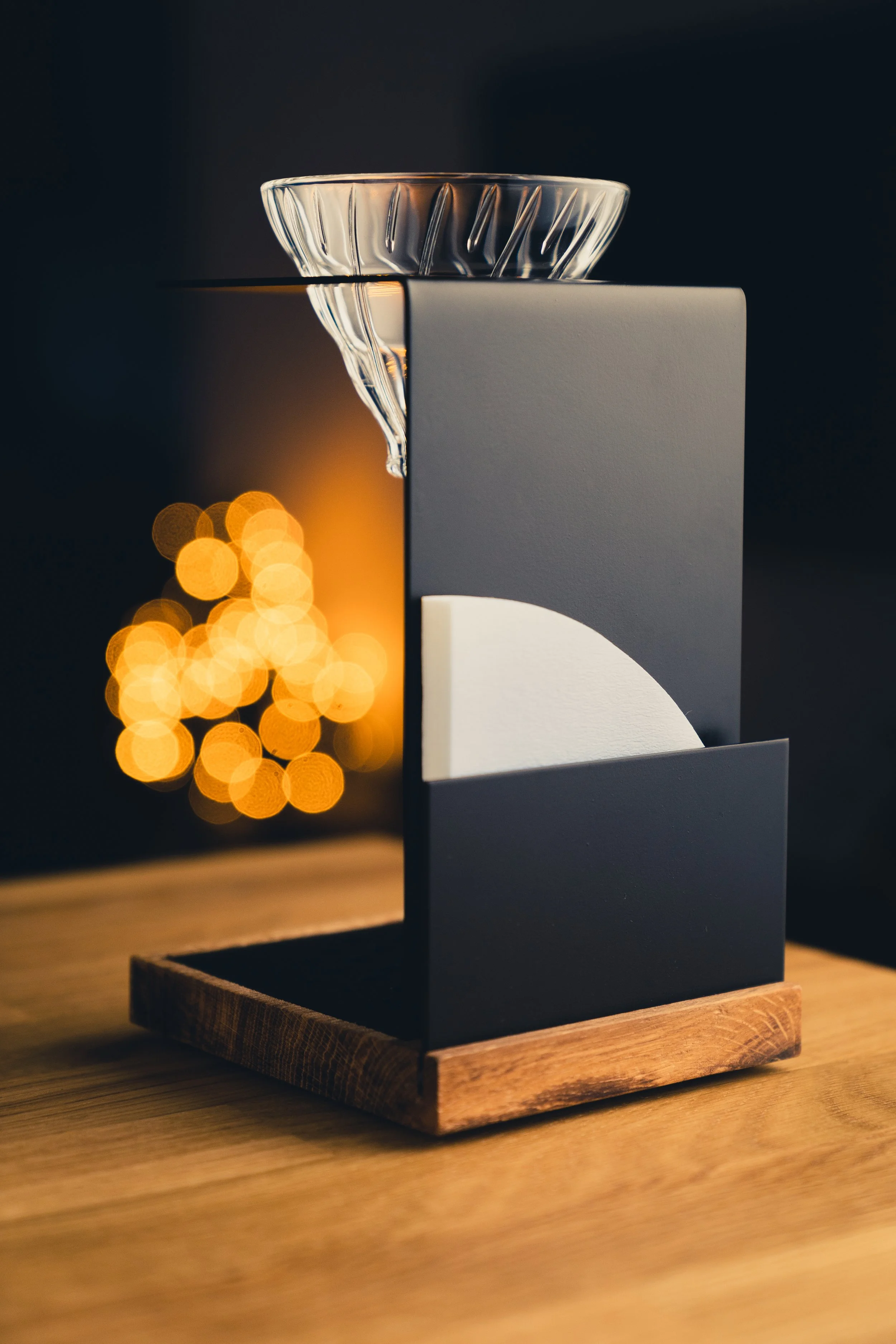 Deze 'pour over dripstation' heb ik gemaakt vanuit mijn passie voor koffie. Zelf miste ik een mooie toevoeging op mijn bar waarbij alles in één product zou zitten. In het eik wordt een laag uitgefreesd zodat dit het overtollige water kan opvangen. Aan de achterkant van de standaard is ruimte om filterpapier op te bergen. Het ontwerp is gemaakt van eikenhout en zwart gepoedercoat staal.